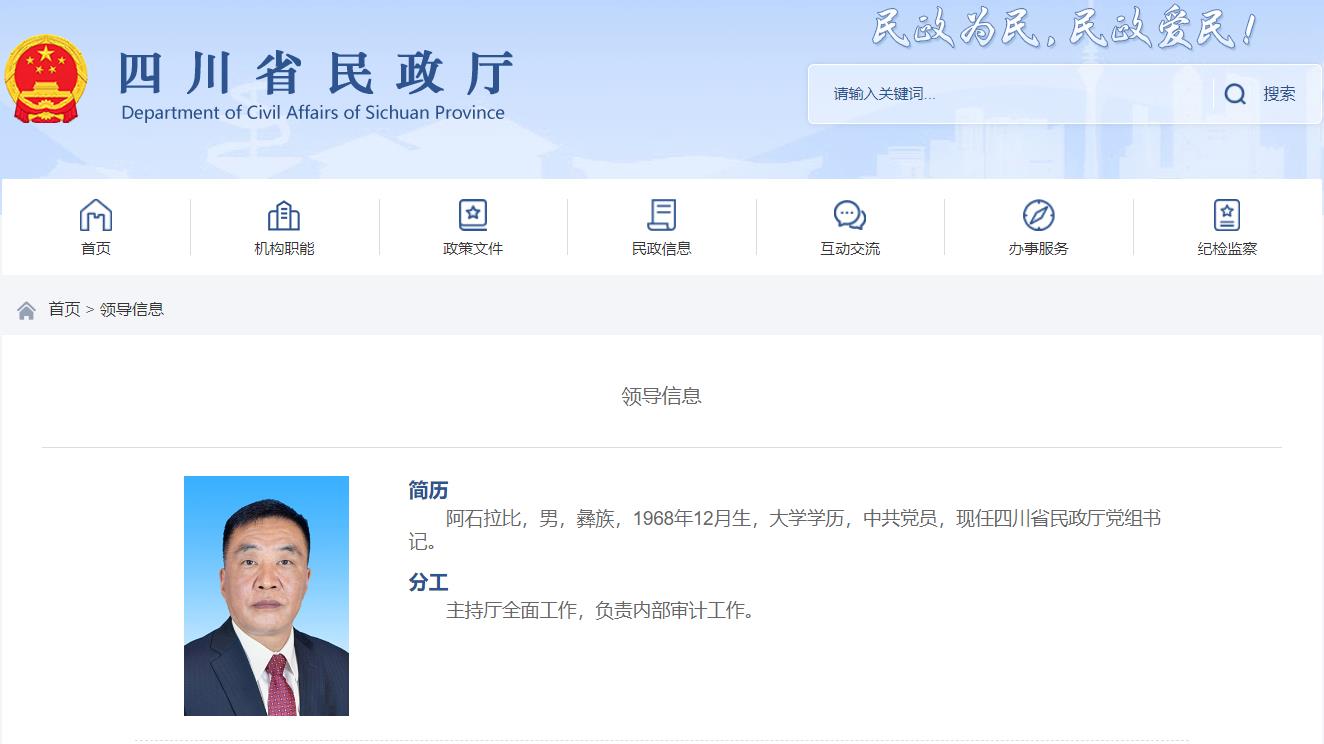 人民網成都8月1日電 (李強強)今日,四川省民政廳網站更新顯示,阿石拉比已任四川省民政廳黨組書記,主持廳全面工作,負責內部審計工作。