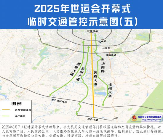 五、2025年8月7日12時至開幕式活動結束,公安機關交通管理部門將根據道路和交通流量的具體情況,對人民南路二段、人民南路三段、人民南路四段及天府大道一線采取疏導、限制通行、禁止通行等措施。社會車輛可選擇經益州大道、劍南大道、科華南路、梓州大道等道路繞行。