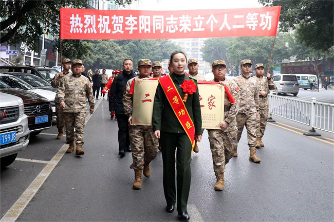 國防科技大學研究生院、瀘州市龍馬潭區人武部、區退役軍人事務局為榮立二等功的軍官李陽及其家屬送立功受獎喜報。瀘州市退役軍人事務局供圖