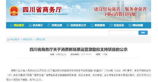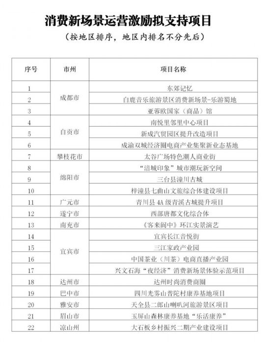 據四川省商務廳網站消息,近日,四川省商務廳發布關于消費新場景運營激勵擬支持項目的公示,擬對22個項目給予激勵。詳情如下: