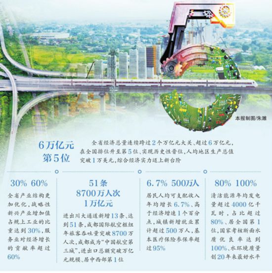 從成渝地區雙城經濟圈建設看,川渝攜手共建的4個特色產業集群均達到萬億規模,成渝綜合性科學中心、西部金融中心、巴蜀文化旅游走廊建設等結出累累碩果,成渝中線高鐵、成達萬高鐵等標志性工程加快建設,兩省市正加快打造高質量發展的重要增長極和新的動力源。從扛牢經濟大省挑大梁政治責任看,省重點項目累計完成投資超過4萬億元,成都成為全國第2個消費突破萬億元的省會城市,六大優勢產業加快提質倍增,數字經濟核心產業增加值突破5000億元,四川加快從經濟大省向經濟強省跨越。