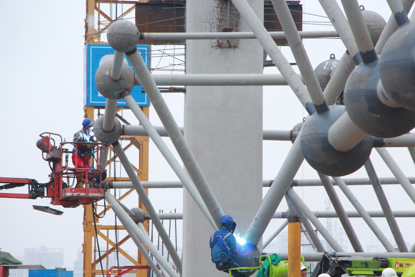 工作正在進行鋼網架采用焊接球節點焊接作業。成達萬高鐵有限責任公司供圖