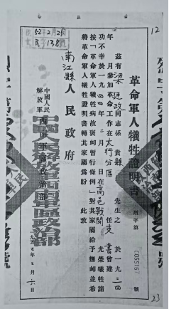 梁廷政的犧牲證明書內容(復印件翻拍)