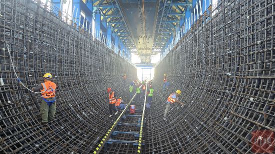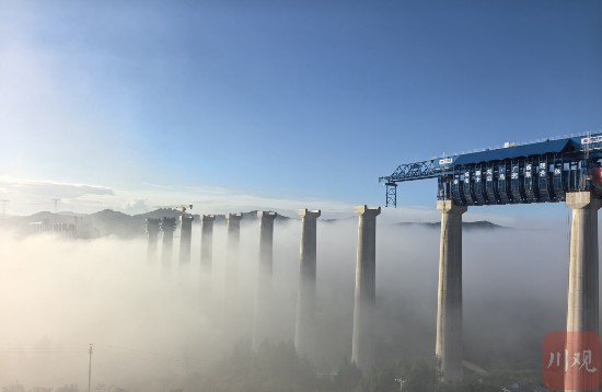 9月25日上午,位于南充市蓬安縣境內的亭子口灌區一期工程桐子壩渡槽籠罩在薄霧中,高大的槽墩群上,兩臺大型造槽機相向而行,槽身內部火花四濺,多名施工人員同步施工,全力推進工程建設進度。