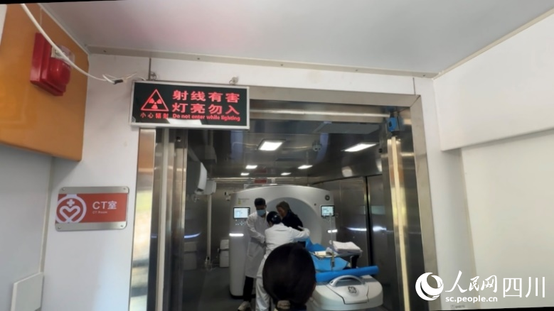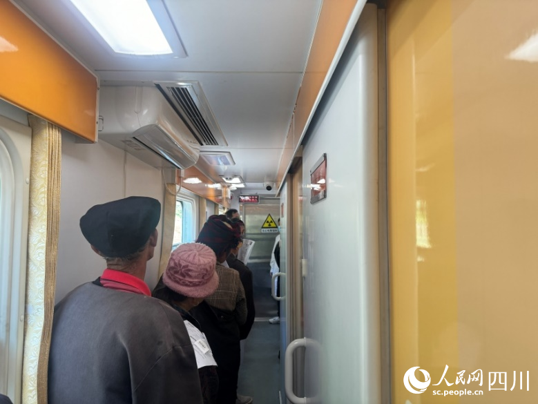 當地村民在列車內排隊準備做CT檢查。實習生 張皓馨攝