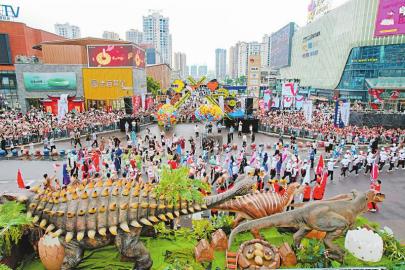 巡游剛啟動,“侏羅紀狂想”方陣點燃現場。13米長的“侏羅紀世界”花車復刻遠古蕨類地貌,5只機械恐龍搖頭擺尾,20名演員與恐龍互動,“恐龍之鄉”的地質文化從博物館“走”到市民眼前。