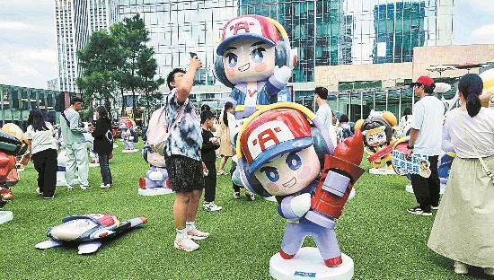 步入展覽現場,首先映入眼簾的是巨型魯班七號裝置以及各種各樣“皮膚”裝扮的不同造型的小號魯班七號。這些裝置按比例還原了魯班七號的經典形象:圓圓的腦袋、短短的腿,以及標志性的機關槍,讓觀眾仿佛置身于“巨人國”的奇幻世界。據了解,展覽生動展示了魯班七號的40種形態動作,涵蓋游戲中的攻擊、技能釋放、行走、回城等經典場景,以及皮膚專屬的獨特動作。此外,身著精美游戲主題服飾的COSER們穿梭在人群中,與觀眾合影留念,而打卡點前則排起了長隊。