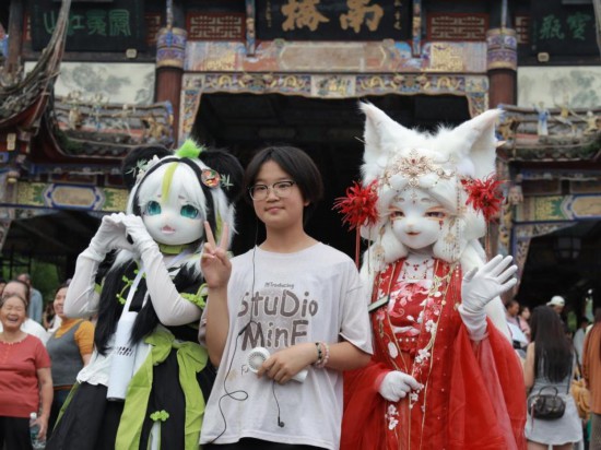 值得一提的是,泠染工作室在舉辦“二次元獸頭展示”的同時,還特別策劃了二次元人物秀,在灌縣古城內熱門點位巡游,引來大量游客駐足觀賞或拍照合影。