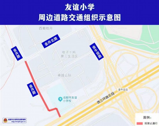 四、2025年10月20日起,工作日每天7:50—8:20;17:20—17:50(寒暑假期除外)對金牛區友誼小學周邊的金卉路(金卉北路至三環路輔道)實施禁止機動車通行的交通管理措施。受限機動車可通過金卉北路、金牛壩路、金瑞路、蜀躍路等道路繞行。