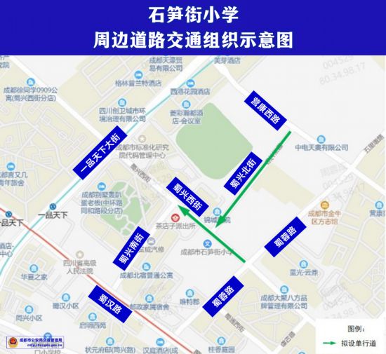 六、2025年10月20日起,工作日每天7:50—8:20;17:00—17:40(寒暑假期除外)對金牛區石筍街小學周邊的蜀興北街(營康西路至蜀興西街)實施機動車由北向南單向通行的交通管理措施;工作日每天17:00—17:40(寒暑假期除外)對蜀興西街(蜀蓉路至蜀興南街)實施機動車由東向西單向通行的交通管理措施。受限機動車可通過一品天下大街、營康西路、蜀蓉路等道路繞行。