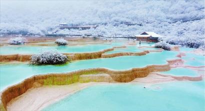 10月20日,阿壩州黃龍景區迎來今年入秋后的第一場雪。黃龍景區供圖