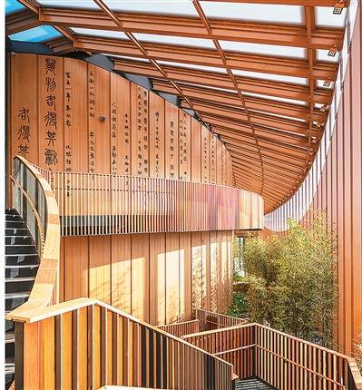 走進中國館,漸次打開的竹簡,將參觀者帶入一個美妙的生態空間,層層遞進、一步一景的園林式展陳設計,引人入勝,體現了含蓄的東方美學。各個主題展覽依次展開,空間高低、明暗變化豐富,呈現出一幅壯麗的山水畫卷。竹簡曲墻之外有細長的格柵帷幕,如同竹簾,簾內有竹林小徑,簾外有林木婆娑,東方園林的意境,讓參觀者獲得獨特的體驗。