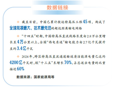 ——2024年,跨區特高壓直流通道輸送清潔能源電量占總送出電量的比重接近60%