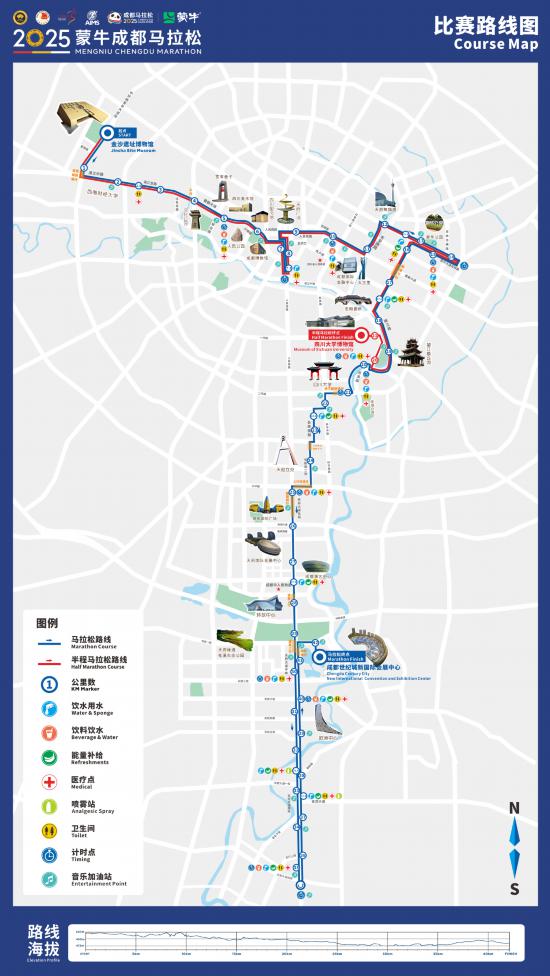 全程馬拉松:金沙遺址博物館東門(起點)→中環路青羊大道段→清江中路→清江東路→蜀都大道十二橋路→蜀都大道通惠門路→蜀都大道金河路→蜀都大道少城路→祠堂街→西御街→人民南路一段→人民南路二段→人民南路二段錦江賓館(折返)→人民南路二段→人民南路一段→西御街→人民南路一段→蜀都大道人民東路→蜀都大道總府路→大慈寺路→東安南路→東安北路→新華大道雙林路→新華大道雙林路交二環路(折返)→新華大道雙林路→一環路東三段→一環路東四段→一環路東五段→順江路→三官堂街→石牛堰路→河濱路→新九眼橋→望江路→郭家橋正街→郭家橋正街輔路→二環路南一段→科華中路輔路→航空路→新希望路→長壽南路→中環路火車南站東路段→天和西二街→南三環路三段輔路→天府大道北段輔路→天府大道北段→天府大道北段輔路→天府大道中段輔路→天府大道中段→天府大道南段→天府大道南段交華陽大道四段(折返)→天府大道南段→天府大道中段→天府大道中段輔路→世紀城路→世紀城新國際會展中心(終點)
