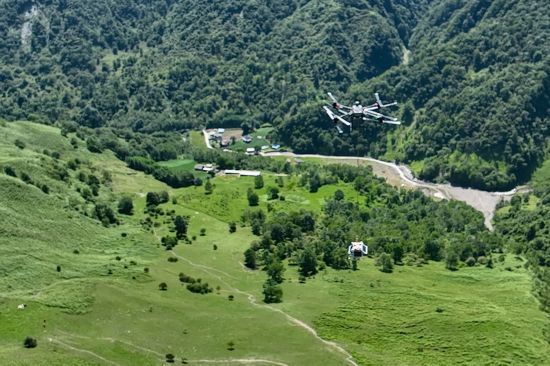 記者看到,這個約27千克的雨量站設備,通過載重無人機的繩子牽引,從山腳“起飛”。與之匹配的,還有一只勘探無人機“開路”,確保其投放地區符合監測條件后,最終投放至高山無人區草坪處。落地后,雨量站要在山區“站穩腳跟”,它的三條支架根據不同地形自動調整,以適應地形,確保雨量站在水平位置,確保準確測量。