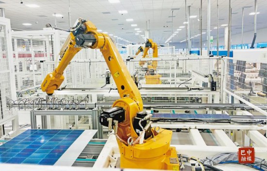 三一硅能·南江2GW高效晶硅光伏組件生產基地的排版機器人正在進行精確定位排列