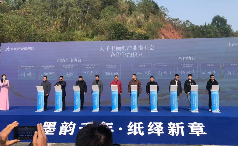 推介會上,舉行了大千書畫紙產業推介及合作簽約儀式,現場發布20余款書畫紙新品及書畫名家“個性定制”紙,舉行夾江手工造紙作坊、大千書畫紙品牌經銷商授牌儀式,四川青衣文化旅游開發有限公司、四川楊灣文化發展集團有限公司作投資推介。